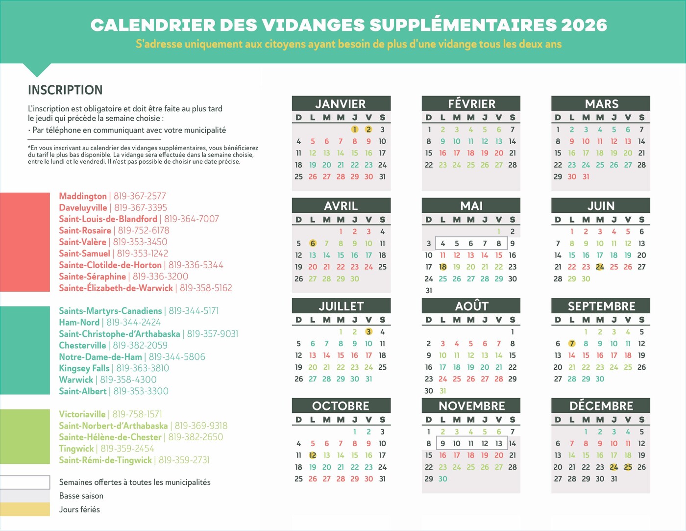 Pour avoir plus d'information sur le programme de vidange des installations septique de la MRC d'Arthabaska, vous pouvez consulter la page à ce sujet sur le site de la MRC d'Arthabaska.